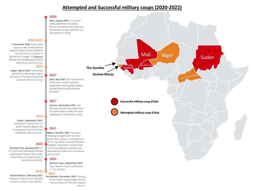 The period since 2020 to present has been eventful in Africa, not least because of the COVID-19 pandemic, but also due to the resurgence of successful military coups that have once again become the norm. Overall, since the beginning of 2020, six successful coups d’état conducted by active members of the military against a civilian government have been recorded in Mali (twice), Guinea, Sudan, and Burkina Faso (twice). In all of these military coups, the same modus operandi can be observed: 1) A faction of the military seizes communication centres and government buildings, detaining the president and the ministerial cabinet; 2) Coup plotters use the national radio station to broadcast to the nation, explaining how the civilian government’s corruption and ineptitude has made it a patriotic requirement for the military to intervene and seize power and 3) The coup plotters promise to return to their barrack and bring about a transition to a democratic system of government as soon as a just and disciplined society has been restored.